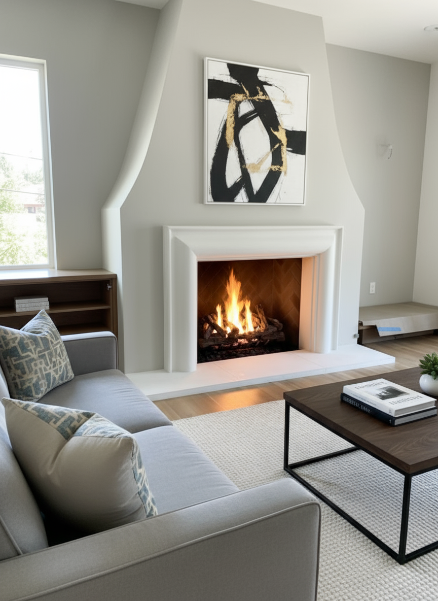 Its simple, sculptural form pairs especially well with plaster, tile, or sleek firebox finishes, making it an ideal choice for homeowners seeking a refined cast stone mantel that blends seamlessly into a calm, elevated living space.