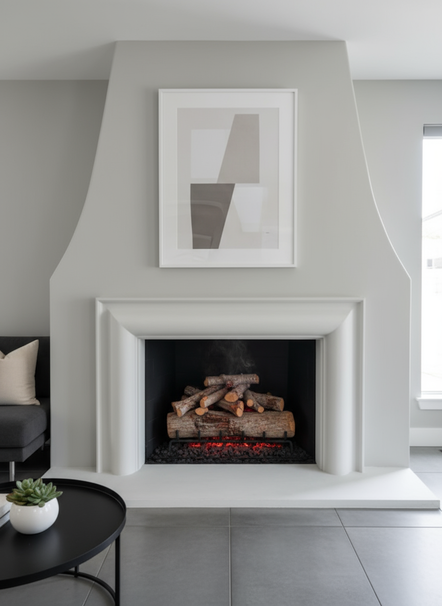 The Brighton cast stone fireplace mantel showcases a soft, contemporary elegance with its smooth curves and sculpted jambs that gently flow into the opening. Its minimalist detailing and rounded profile create a clean, architectural look that feels both modern and timeless.
